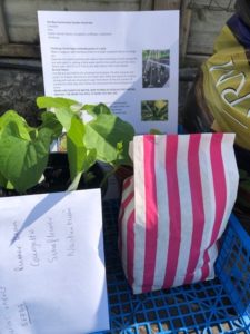 Using free mushroom baskets from the local greengrocer I put together some Grow Boxes with what we had to hand: a small bag of compost, a pot of sprouted climbing French beans, an envelope containing an instruction sheet, little packs with a few seeds in and a few pots and plant labels. Each box was accompanied by 10 bamboo canes to help the plants grow upwards.