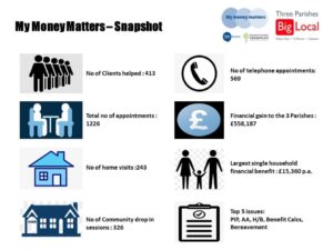 So far, the project has been a brilliant success and has helped 413 residents in Three Parishes Big Local access a total of over half a million pounds.