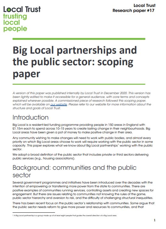 This briefing is part of our Local Trust research papers series, originally shared internally with staff and explores the relationship between Big Local partnerships and the public sector, bringing together existing information and data from within the Big Local programme to understand: who Big Local partnerships work with within the public sector, the nature of their relationships with the public sector, and the challenges and opportunities surrounding relationships.