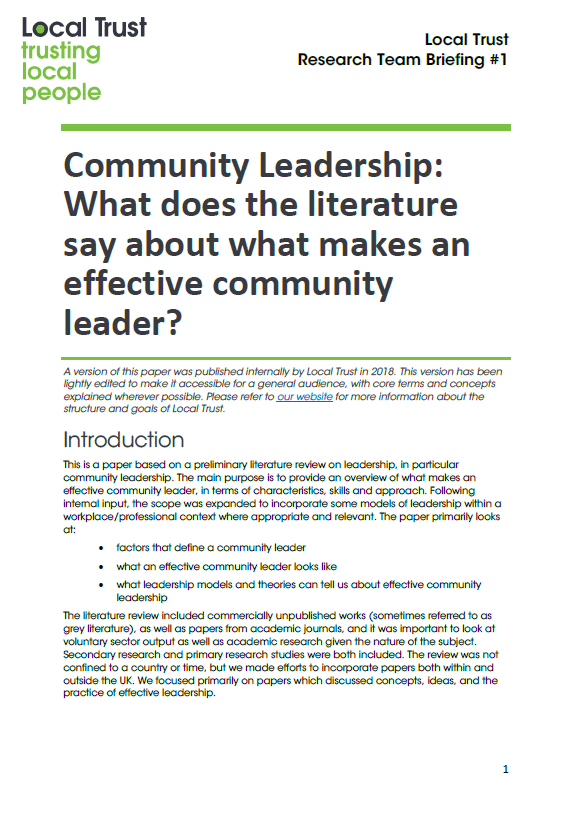 This briefing is part of our Local Trust research papers series, originally shared internally with staff. It explores the literature on community leadership, to identify: