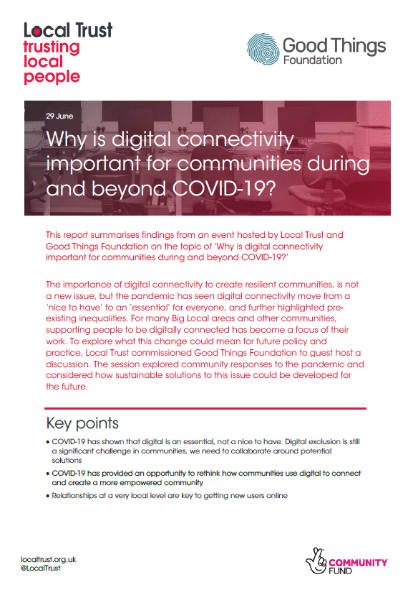 The importance of digital connectivity for resilient communities is not a new issue. However, the pandemic has seen digital connectivity move from a ‘nice to have’ to an ‘essential’ for everyone and highlighted pre-existing inequalities. For many Big Local areas and other communities, supporting people to be digitally connected has become a focus of their work during the pandemic. To explore what this change in context could mean for future policy and practice, Local Trust commissioned Good Things Foundation to guest-host a discussion exploring community responses to the pandemic and how sustainable solutions to the issue of digital exclusion could be developed.