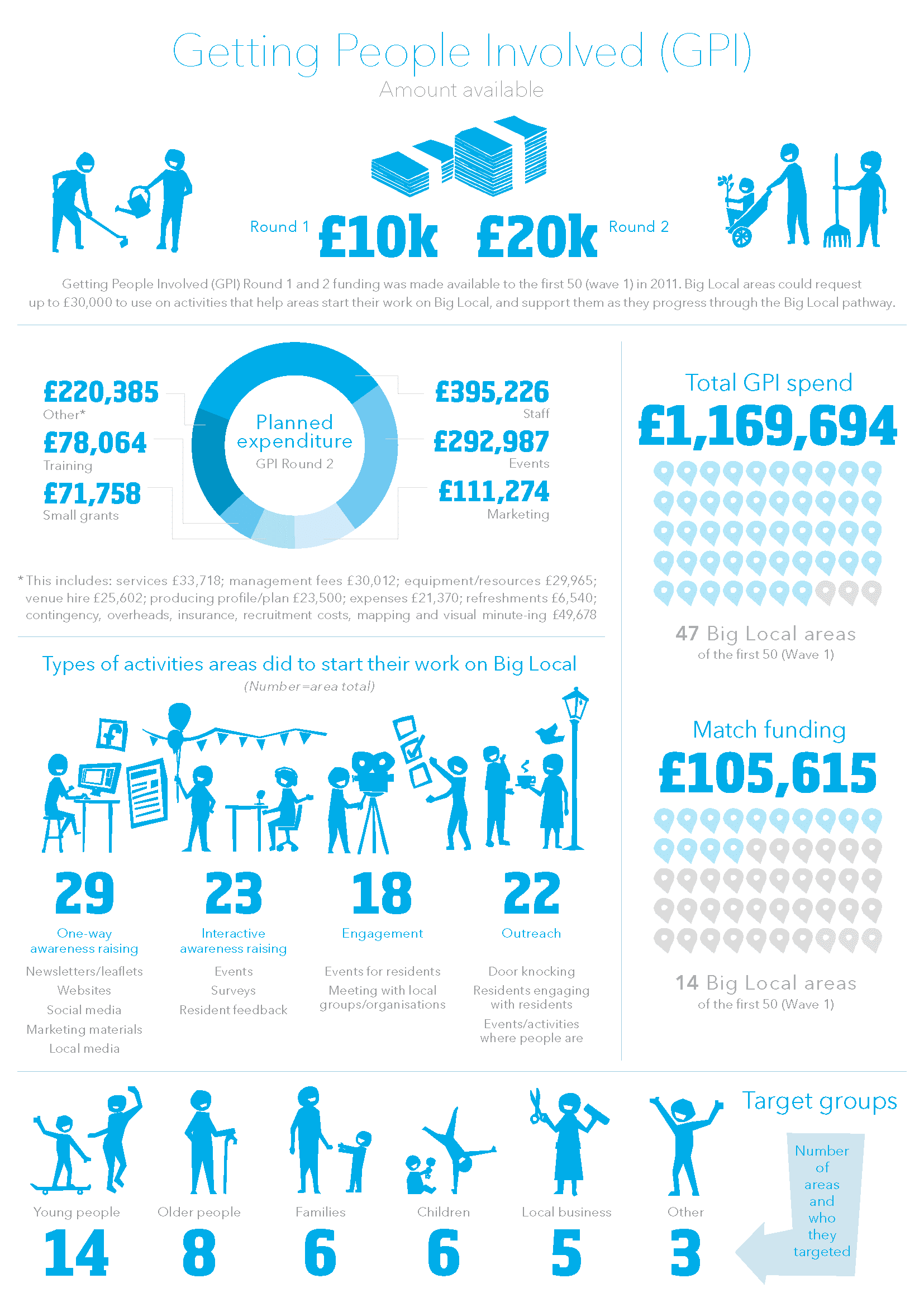 Getting People Involved (round 2) funding was made available in 2012 to support the first 50 Big Local areas in the early stages of Big Local. Areas could request up to £30,000 through Getting People Involved. (£10,000 round 1, £20,000 round 2).