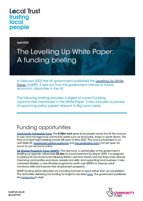This briefing provides a digest of current funding opportunities mentioned in the White Paper. It also includes a preview of upcoming policy papers relevant to Big Local areas.