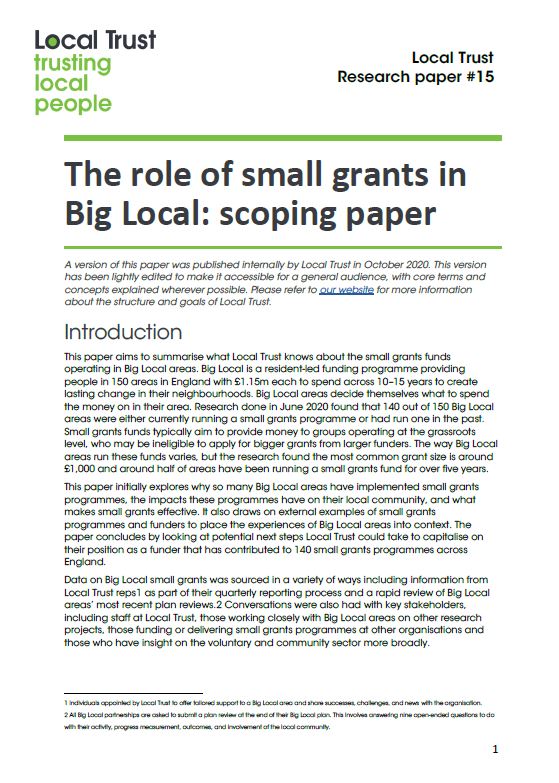 This paper is part of our Local Trust research papers series, originally shared internally with staff and explores why so many Big Local areas have implemented small grants programmes, the impacts these programmes have on their local community, and what makes small grants effective. It also draws on external examples of small grants programmes and funders to place the experiences of Big Local areas into context. The paper concludes by looking at potential next steps Local Trust could take to capitalise on their position as a funder that has contributed to 140 small grants programmes across England.