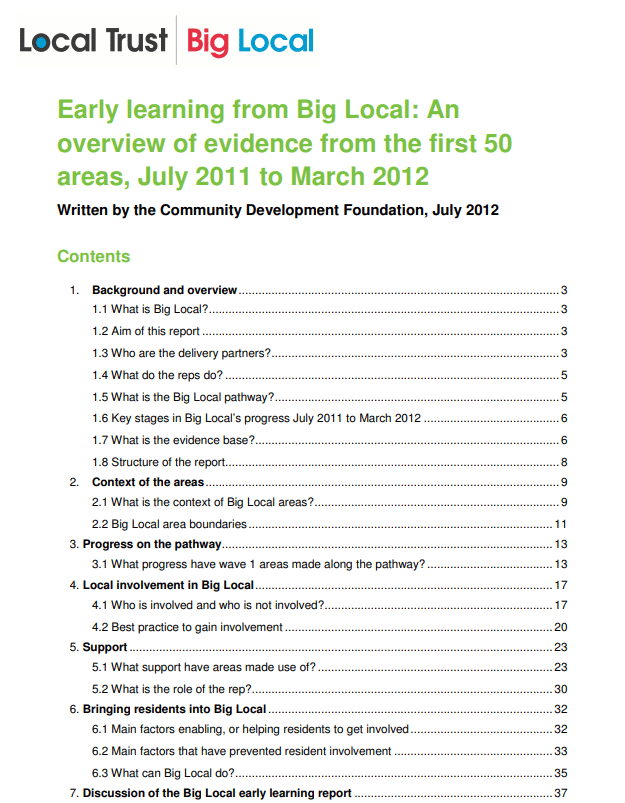 Produced by the Community Development Foundation the Big Local early learning report is based on information collected by Local Trust and delivery partners between July 2011 and March 2012, and as such is based on information from the first 50 Big Local areas. In it is some really useful and interesting learning for Local Trust and our partners, which has already started to inform our development and delivery of Big Local, and – we think – improve the quality and direction of support to each Big Local area through the pathway.