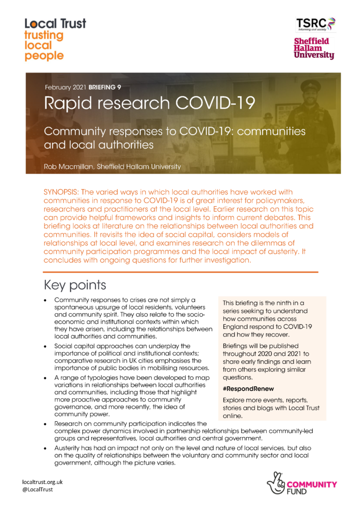The varied ways in which local authorities have worked with communities in response to COVID-19 is of great interest for policymakers, researchers and practitioners at the local level. Earlier research on this topic can provide helpful frameworks and insights to inform current debates. This briefing looks at literature on the relationships between local authorities and communities. It revisits the idea of social capital, considers models of relationships at local level, and examines research on the dilemmas of community participation programmes and the local impact of austerity. It concludes with ongoing questions for further investigation.