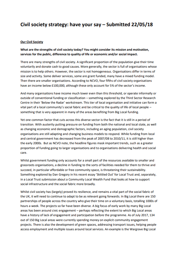 Read Local Trust’s response to the government’s consultation on their Civil Society Strategy, which ran from February to May 2018. We share learning and experience from the Big Local programme and explain how radical devolution of power to communities and strong investment in social infrastructure are vital to building the power and capability of civil society.