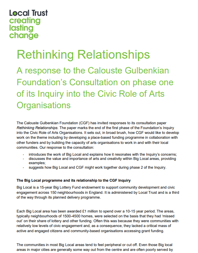 Local Trust's response to The Calouste Gulbenkian Foundation's consultation on the civic role of arts organisations.