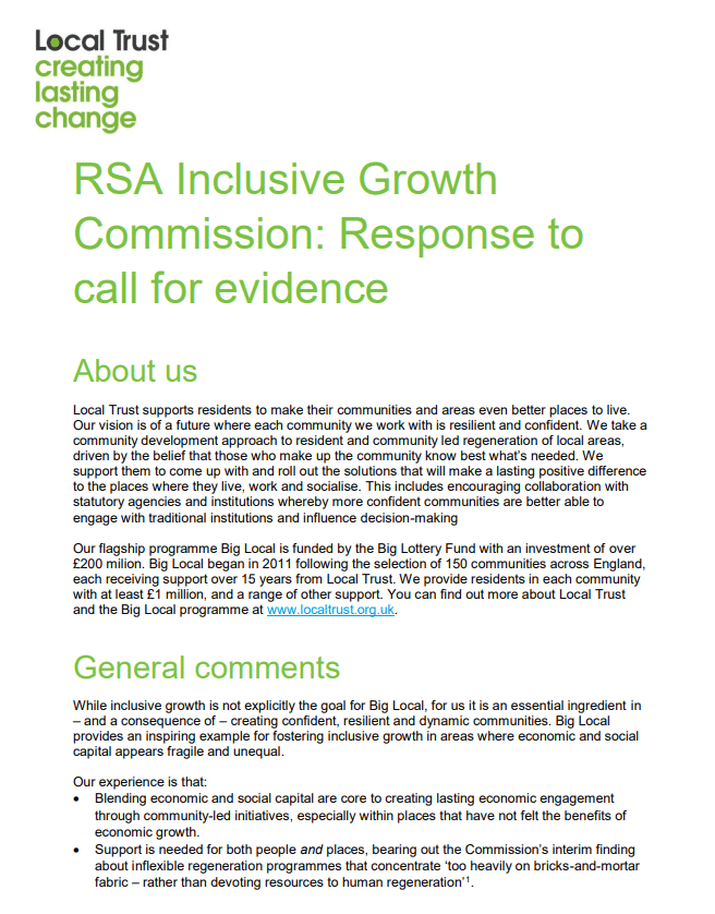 Local Trust's response to a call for evidence by the RSA's Inclusive Growth Commission.