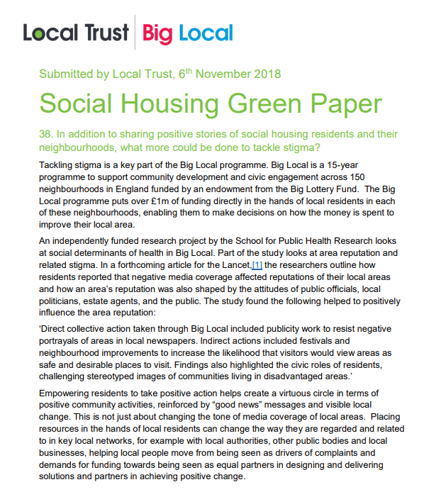 Read our response to the government’s consultation on social housing, which ran from August to November 2018. We talk about tackling the stigma surrounding social tenancy, and how the Big Local principles have the potential to improve the experience of social housing residents by putting power and assets in the hands of communities.