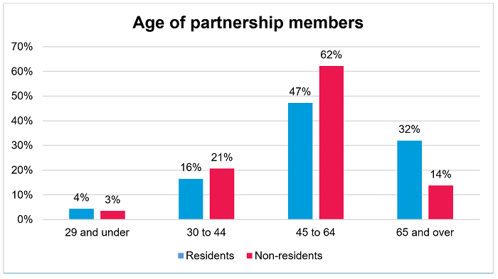With many non-resident partnership members there in a paid capacity it is no surprise to see that they are also generally of working age and therefore slightly younger than resident members. Almost a third (32%) of residents are 65 and over compared to just 14% for non-residents.