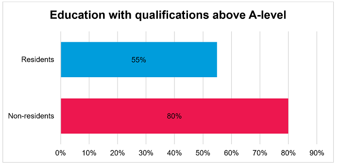 Both residents and non-residents have a higher proportion of people with a qualification above A-level than the national average of 38%. However, a much larger proportion of non-residents have a qualification above A-level with 4 out 5 having one compared to just over half of residents.
