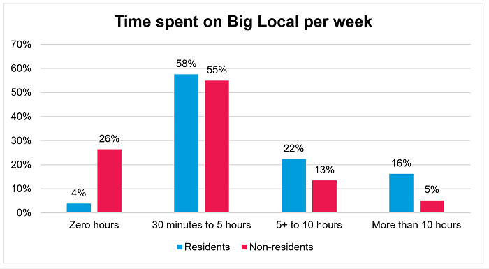 While non-residents are generally younger and with a higher education qualification, it is residents who spend more time on Big Local. 38% of residents spend more than five hours a week on Big Local compared to 18% of non-residents. More than a quarter (26%) of non-residents spend zero hours a week on Big Local compared to just 4% of residents. This is probably because non-residents participate on partnerships as part of their job whereas most residents are there as volunteers, giving their time for free.