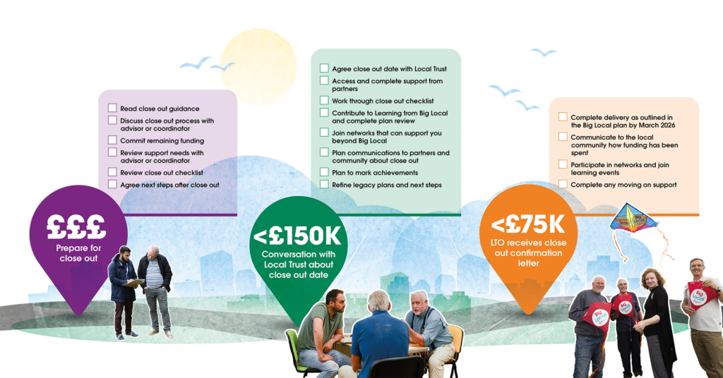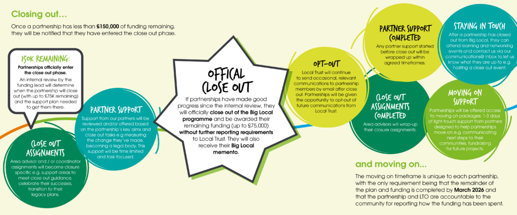 Partnerships will primarily be supported to close out by their Local Trust funding lead, but you will continue to receive support from your Big Local area advisor or coordinator.