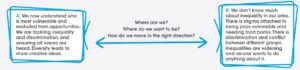 The staff and chair worked hard to think about how to make the experience of developing the plan enjoyable and engaging – creating hand-painted and graphic representations of the survey results rather than sending out formal or text-based documents. Zoom sessions were planned to be interactive, with each session involving experimental uses of Miro, a V-wall, breakouts and warm- ups, and limited to one hour and 15 minutes.